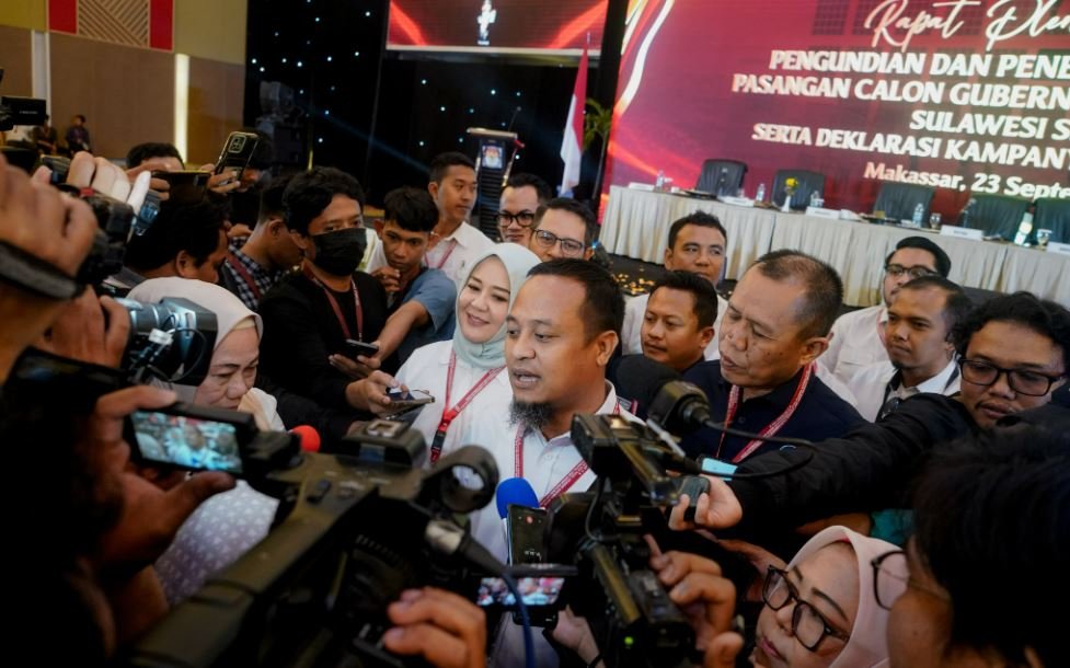 MAKASSAR – Pasangan Andi Sudirman Sulaiman-Fatmawati Rusdi (Andalan Hati) melenggang ke kontestasi pemilihan Gubernur dan Wakil Gubernur Sulsel dengan nomor urut 2 pada seremoni pengundian dan penetapan nomor urut oleh KPU Sulsel, di Hotel Claro Makassar, Senin (23/9/2024).