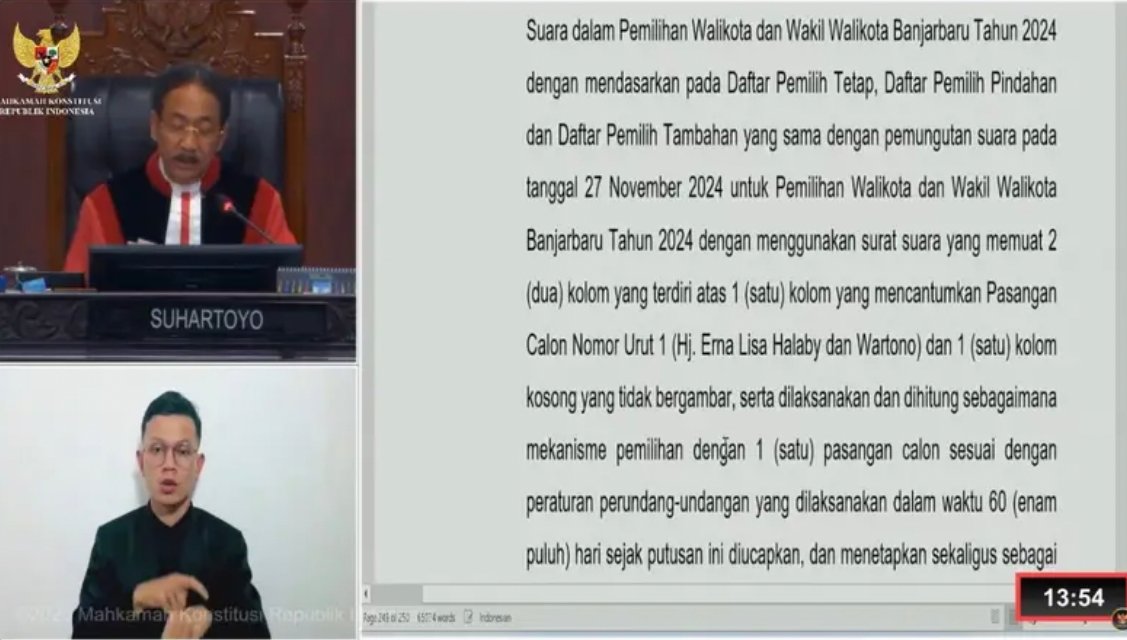 Smartwarta, Banjarbaru – Mahkamah Konstitusi (MK) memutuskan untuk mengulang Pemilihan Kepala Daerah (Pilkada) Kota Banjarbaru setelah memeriksa Perselisihan Hasil Pemilihan Umum (PHPU). Putusan ini dibacakan Senin, 24 Februari 2025, oleh Hakim MK Suhartoyo.